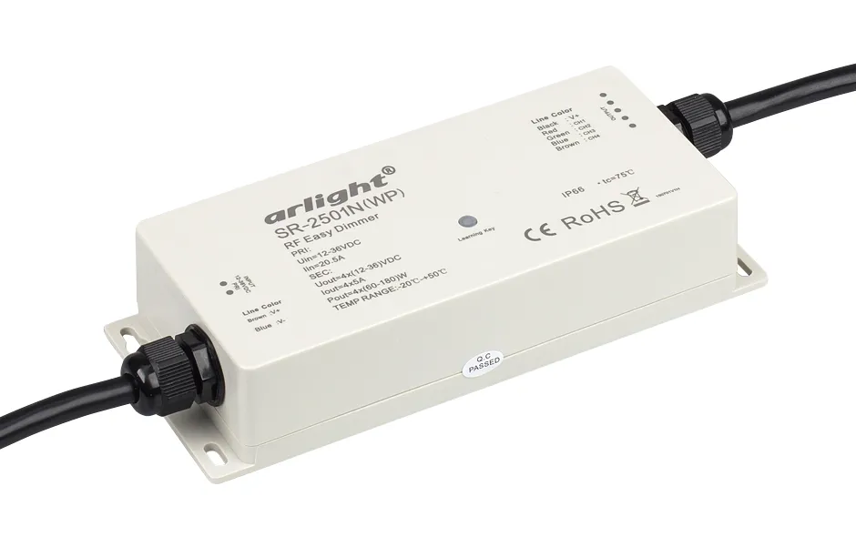 Водонепроницаемый диммер RF (IP67) для с/д лент 12-36V. Мощность 240-720W, макс.ток 4х5A. Список совместимых пультов см. в сопутствующих товарах и в инструкции. Размер 180x73x38 мм.Замен-ся на контроллер 019672 SR-1009FAWP.
