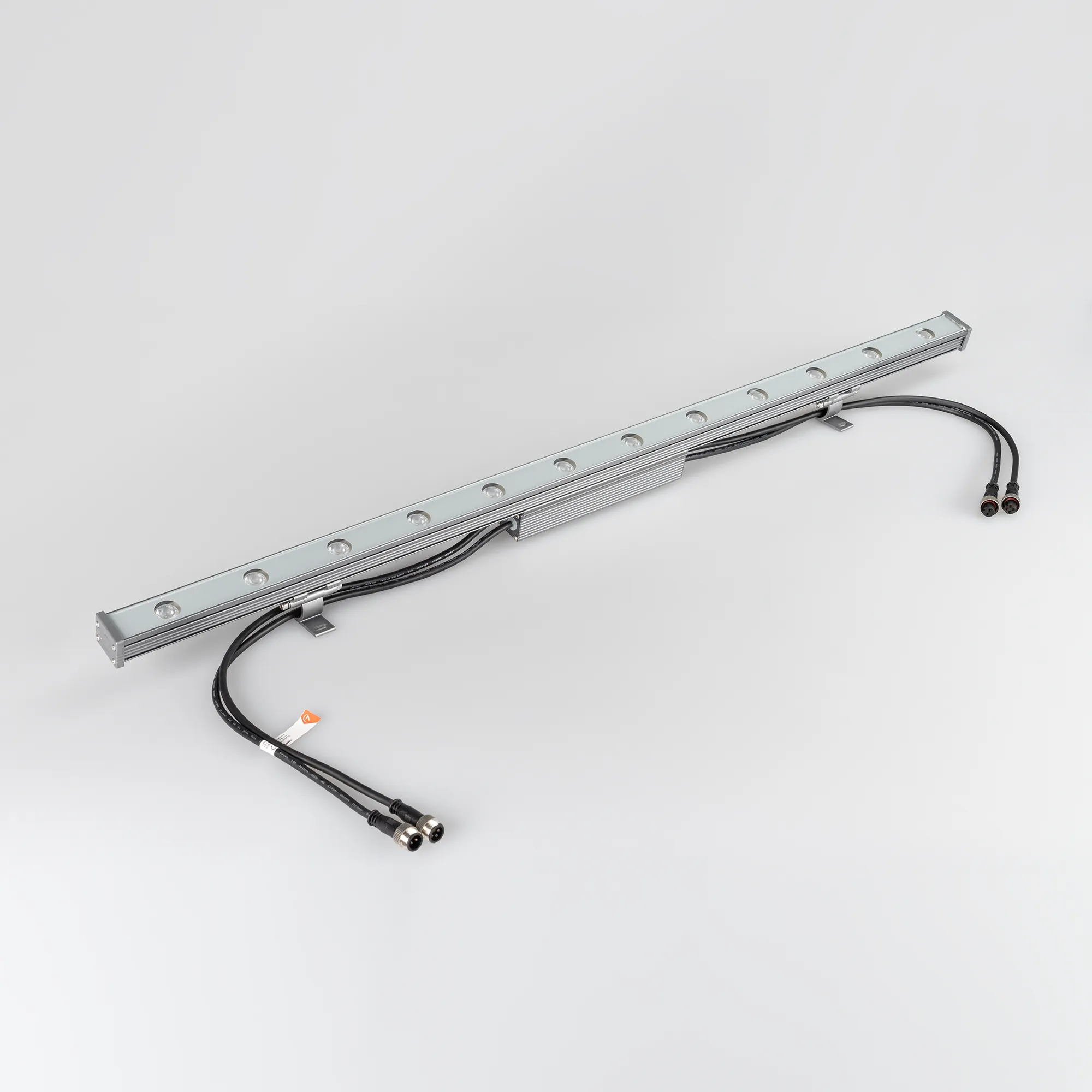 Ультратонкий линейный светодиодный прожектор. Мощность 12W, напряжение питания DC 24V. Светодиоды EPILED 12 штук. Цвет светодиодов RGB, управление по протоколу DMX512, угол рассеивания 30°. Корпус: алюминиевый сплав и армированное стекло. Цвет корпуса серый, степень влагозащиты IP65. Габариты 1000x40x30мм.
