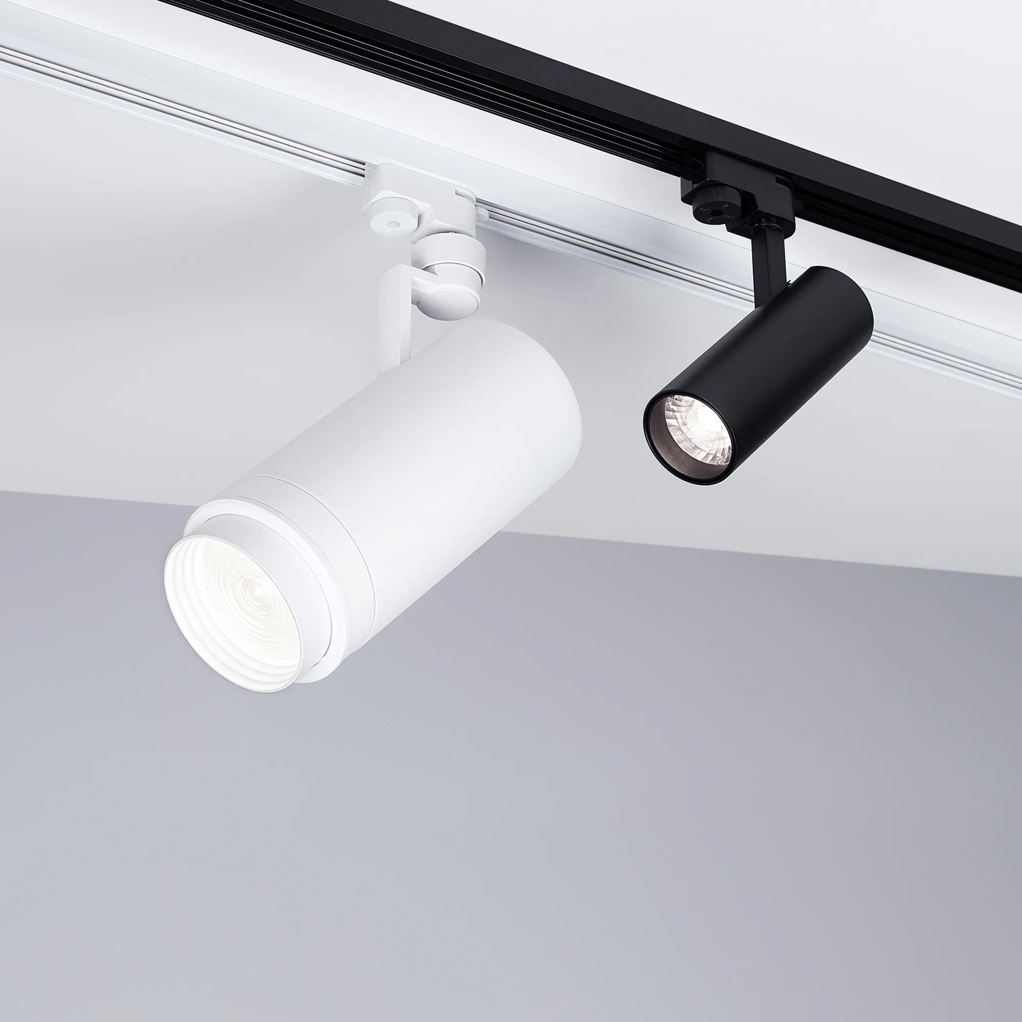 Светильник подвесной для треков/шин 2 провода. Мощность 10 Вт, св. поток 860-1060 лм, 90 лм/Вт, белый 6000 K, CRI>90, угол 24°, напряжение питания 230 В. Черный круглый корпус из алюминия, материал линзы PMMA , степень защиты IP20. Размер: диаметр 55 мм, высота 145 мм. Монтаж на трек 1-фазный. Драйвер встроенный 27-38 В, 260 мА., пульсация <1%.