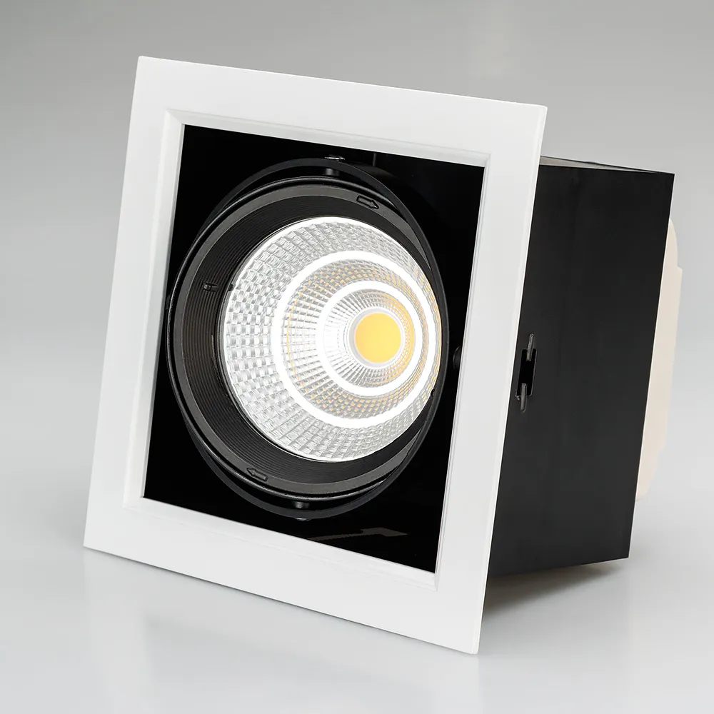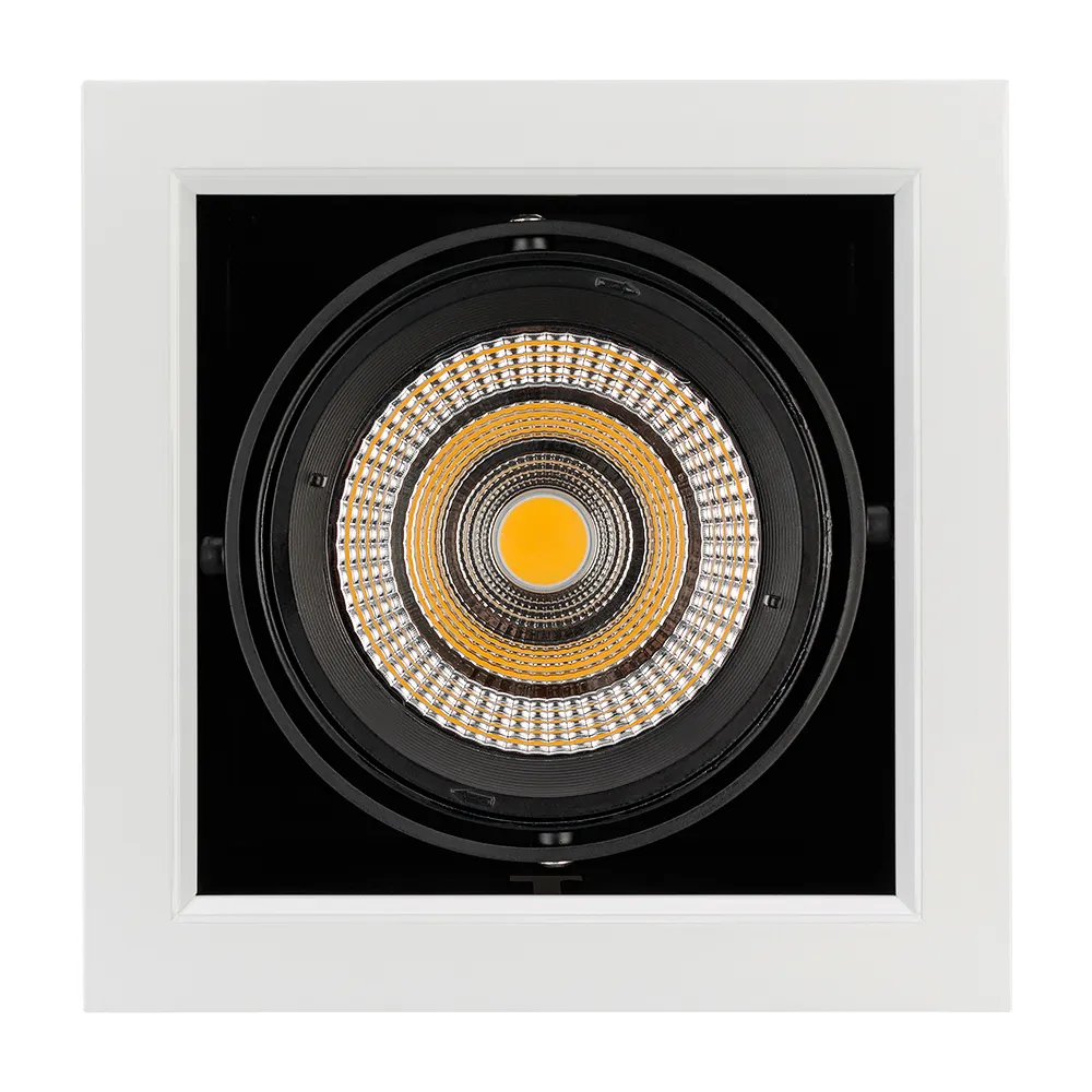 Встраиваемый карданный светильник. Угол 30° / 25Вт / БЕЛЫЙ 6000K / 2200лм, CRI>90. Корпус из белого алюминия с черными вставками. Питание AC220-240V, 25Вт, 700mA 30-42V, драйвер встроенный. Размеры LxWxH: 190х190x145мм, отверстие для установки 165x165мм.