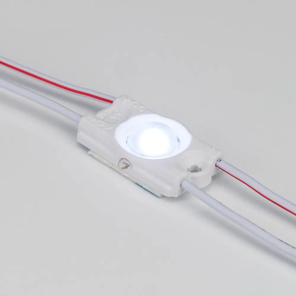 Герметичный светодиодный модуль IP67, ХОЛОДНЫЙ 8000–10000 К, напряжение 12 В, мощность 0.48 Вт, св. поток 45 лм, 1 светодиод SMD 2835, угол 160°. 50 шт на проводе, расстояние между центрами модулей 105 мм, длина провода между модулями 75 мм, рекомендуемая глубина установки 30–100 мм. Размер 29.5×16×5.9 мм. Гарантия 5 лет.