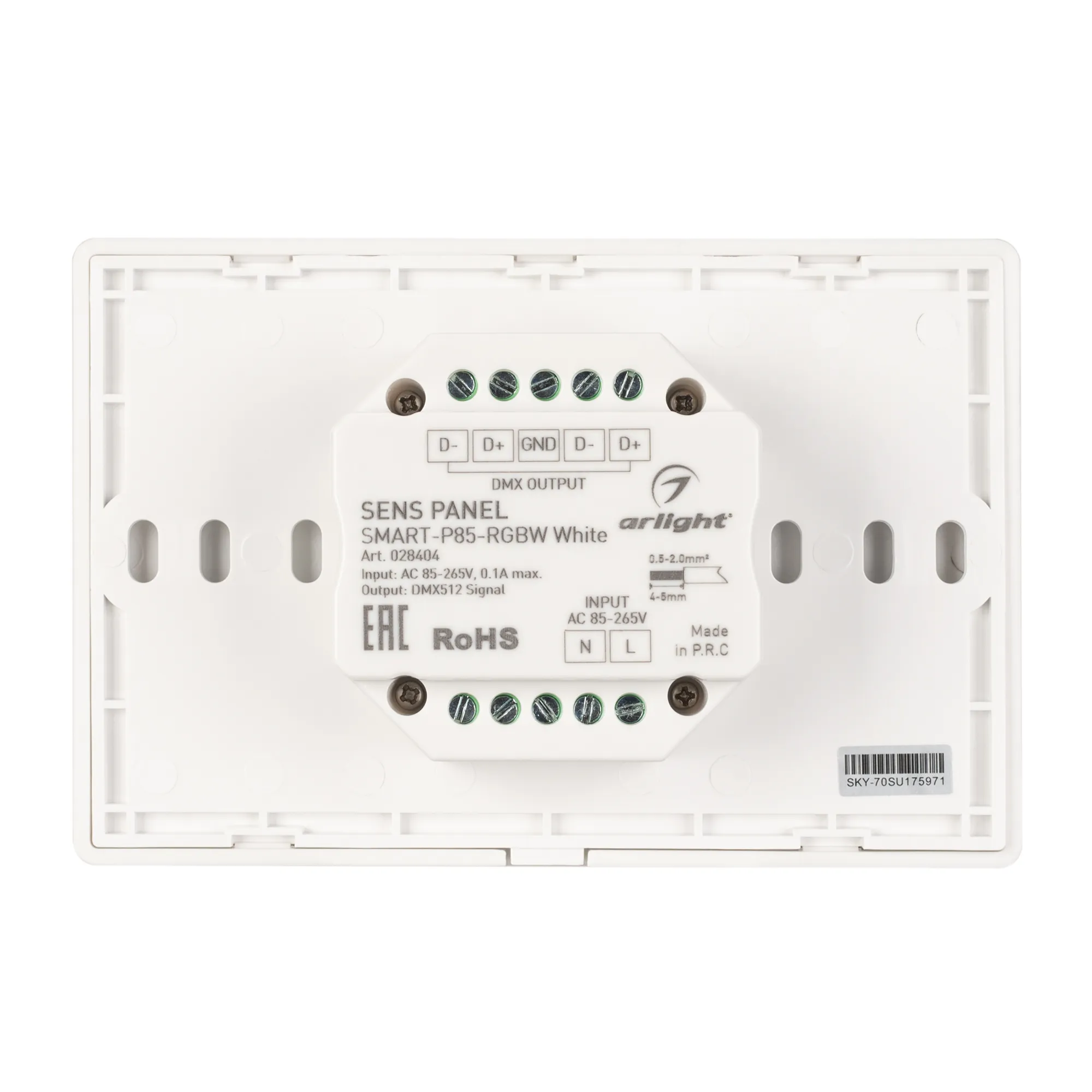 Встраиваемая сенсорная панель 2.4 ГГц, цвет белый. Итальянский стандарт. Материал - стекло. Для управления RGBW источниками света (ШИМ), 4 зоны управления. Функция управления DMX512 устройствами. Питание/рабочее напряжение AC 85-265V. Габариты 120х80х37 мм, устанавливается в стандартный подрозетник. Панель совместима с контроллерами серии SMART.