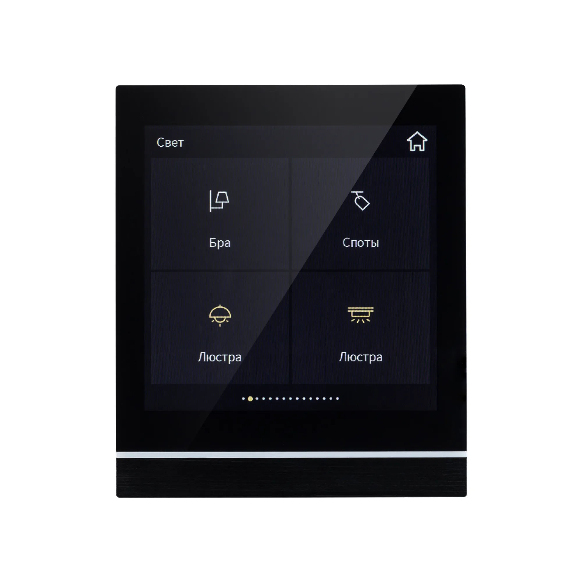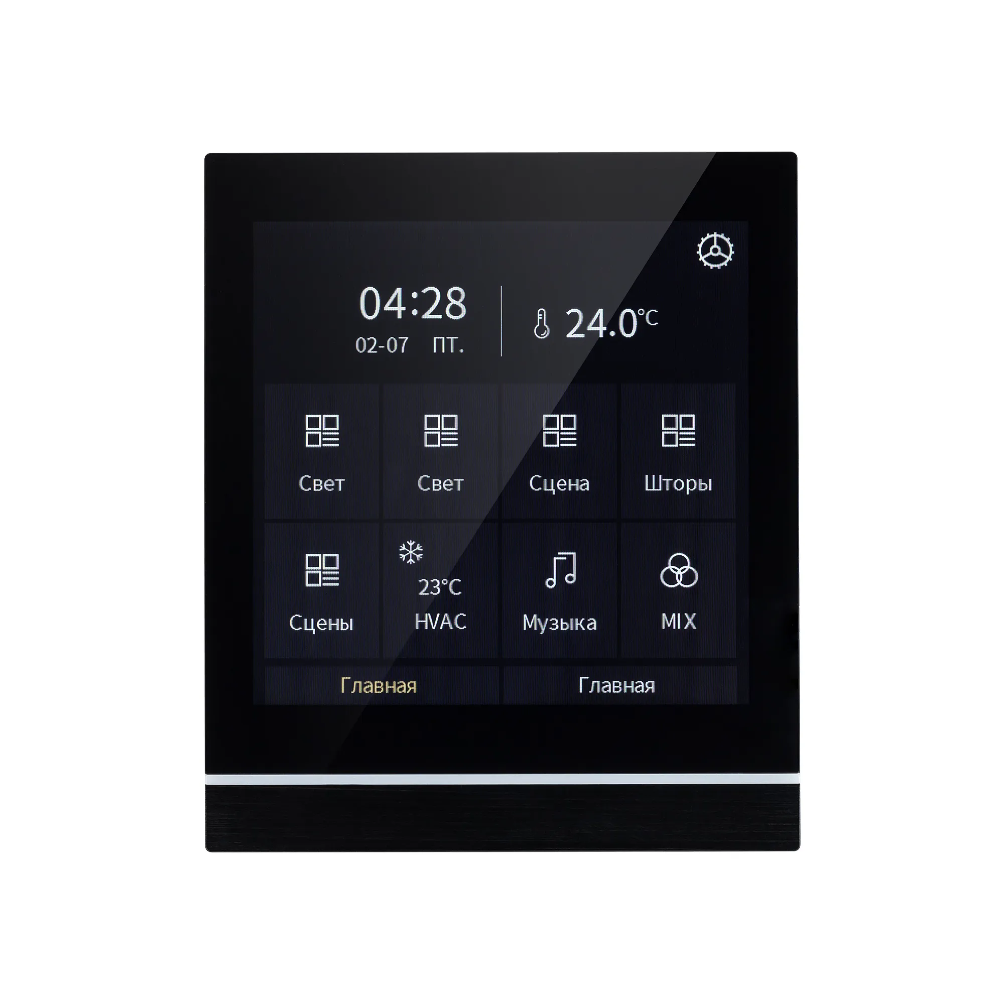 Многофункциональная встраиваемая настенная панель стандарта KNX с цветным сенсорным дисплеем 4.0”. До 16 слайдов, на каждом до 8 элементов управления. Виджеты для RGBW, MIX (CCT), климатики, мультимедиа. Встроенный датчик температуры. Логические функции. Разрешение экрана 480*480. Требуется дополнительное питание AUX DC 24-30V. Размер 86x101x32 мм.