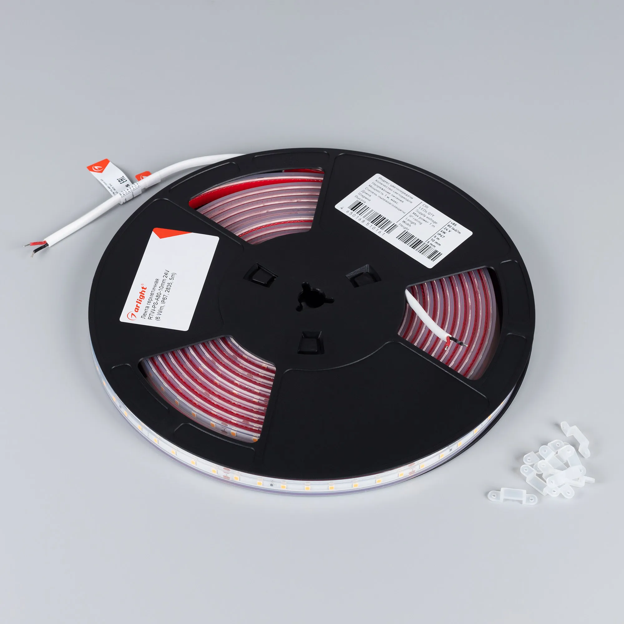 Светодиодная герметичная лента RTW серии A80 (монтажная бобина 50 м), IP67 (PS - силиконовая экструзия). Светодиоды SMD 2835, 80 шт/м, белая плата шириной 8 мм, скотч 3M. Цвет ТЕПЛЫЙ 2700K, индекс цветопередачи CRI>85, угол 120°. Питание 24 В, мощность 6 Вт/м (300 Вт на 50 м). Размеры 50000x10x5 мм. Мин. отрезок 100 мм, 8 светодиодов. Цена за 1 м. Разрезать перед подключением. Макс. длина подключения 5 м.