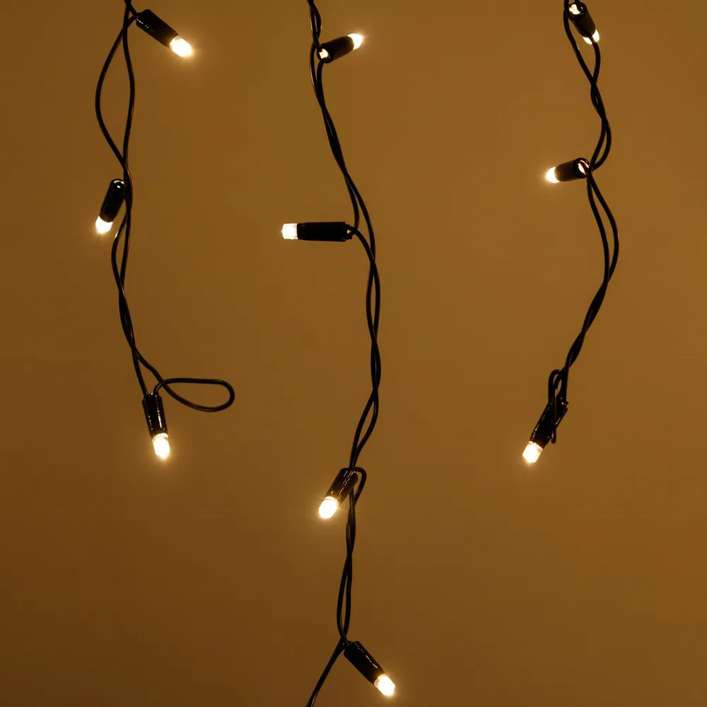 Светодиодная бахрома Pro. Размер 5600x900 мм (длина 5600 мм, по длине 48 нити высотой 200/900 мм). Количество светодиодов 240 шт размером 7 мм. Цвет свечения ТЕПЛЫЙ БЕЛЫЙ (3000 К), эффект постоянного свечения с мягким световым рисунком (выпуклая молочно-белая линза). Провод черный, резиновый. Питание 230 В, Мощность 15 Вт, защита IP65, применение на улице под навесом. Аксессуары для подключения приобретаются отдельно.