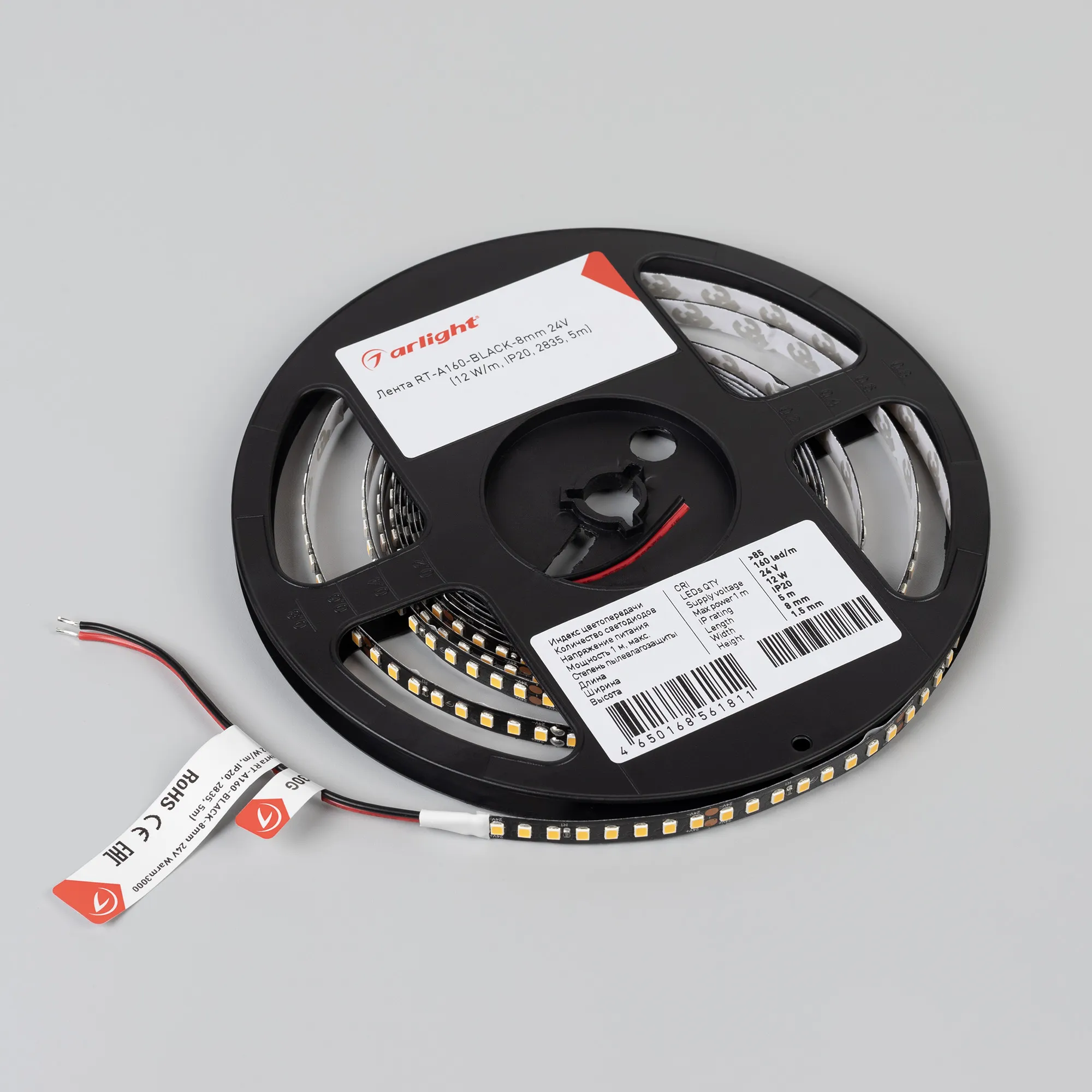 Лента светодиодная RT-A160-BLACK-8mm 24V Warm3000 (12 W/m, IP20, 2835, 5m) (Arlight, высок.эфф.150 лм/Вт)
