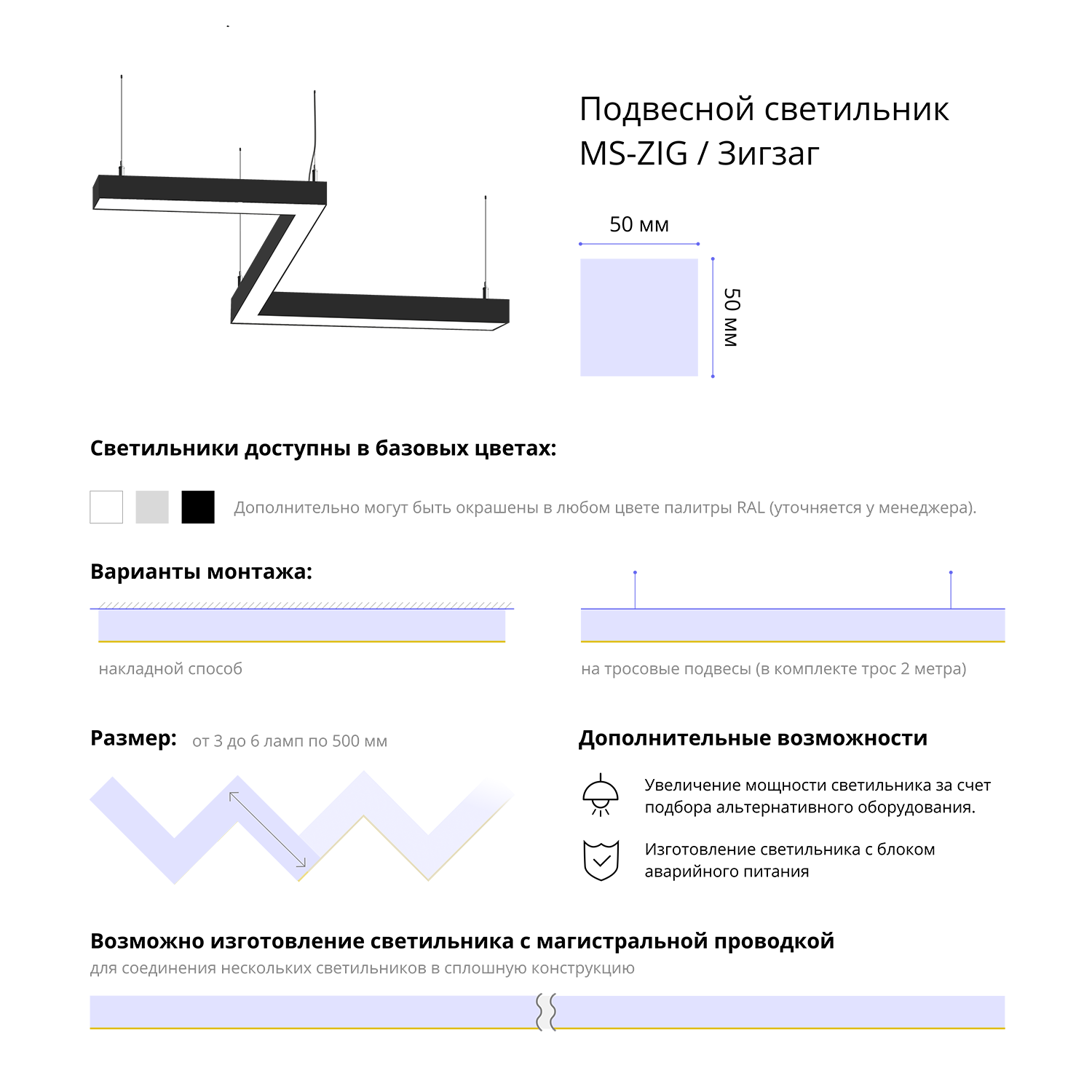 Cветодиодный фигурный светильник MS-ZIG Зигзаг размер профиля 50x50мм длиной 4х500мм мощностью 80W. Светильник собирается из алюминиевого основния с матовым рассеивателем, который дает равномерную засветку по всей площади.