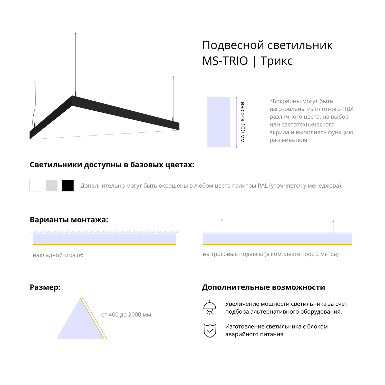 Cветодиодный фигурный светильник MS-TRIO Трикс длиной 1200мм мощностью 75W. Светильник собирается из алюминиевого основния с матовым рассеивателем, который дает равномерную засветку по всей площади.