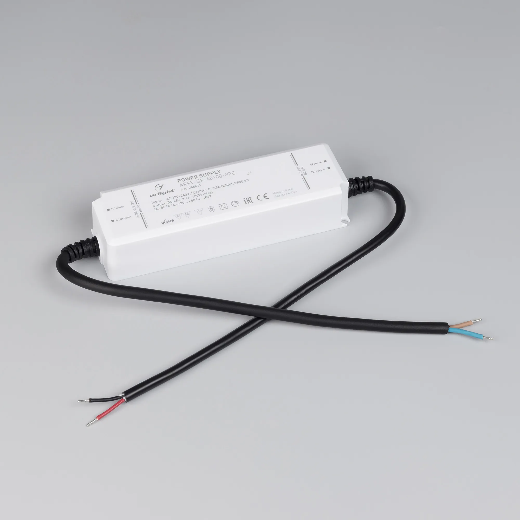 Источник напряжения с гальванической развязкой для светодиодных изделий. Входное напряжение 220-240 VAC. Выходные параметры: 48 В, 2,1 А, 100Вт. Встроенный PFC >0.95. Герметичный пластиковый корпус IP 67. Рабочая температура -20…+45C⁰. Габаритные размеры длина 156 мм, ширина 48 мм, высота 33 мм. Гарантийный срок 5 лет.