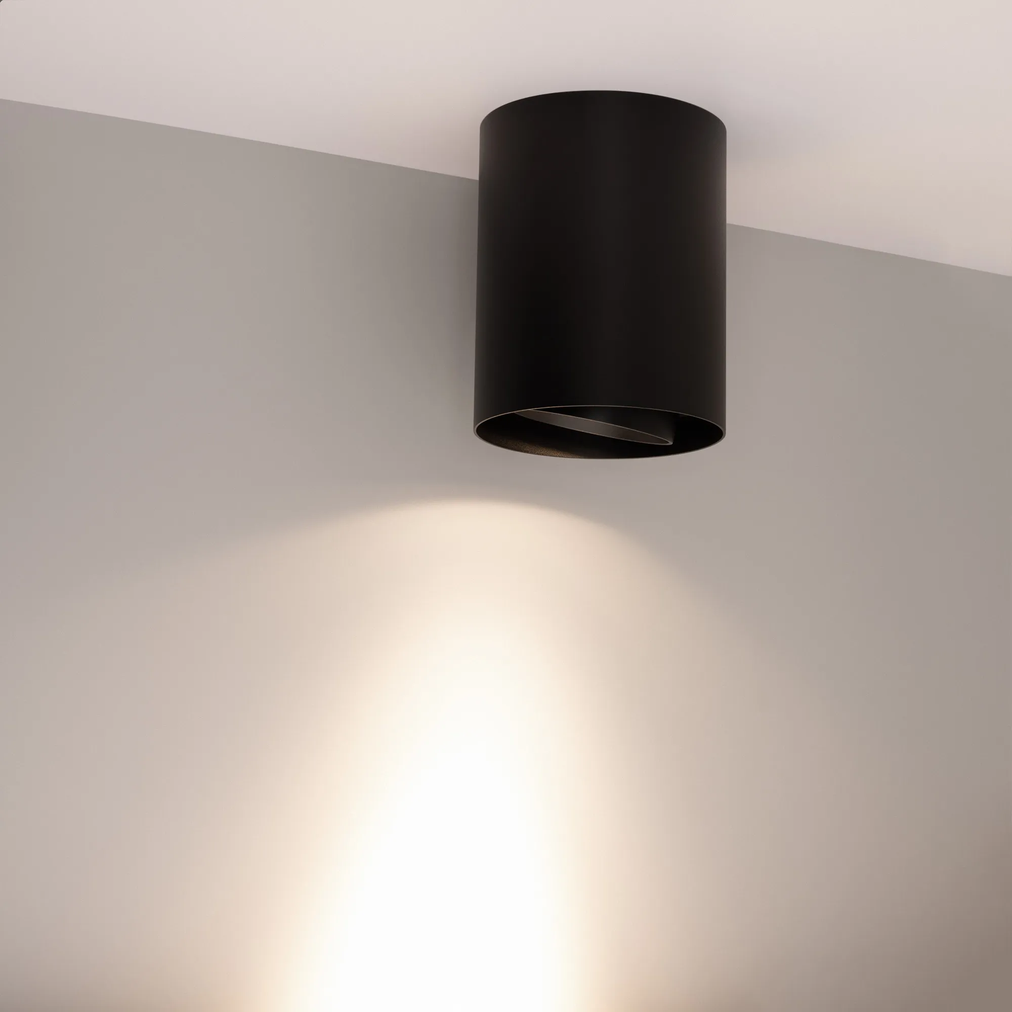 Накладной интерьерный светильник. Мощность 24 Вт, св. поток 2400 лм, 99 лм/Вт, дневной 4000 K, CRI>90, угол 15°, регулируемое направление луча 40°(20+20), поворотный световой модуль вокруг своей оси на 340°, UGR <11, напряжение питания 230 В. Чёрный круглый корпус из алюминия, степень защиты IP54. Размер: диаметр 132 мм, высота 165 мм. Монтаж накладной. Драйвер 27-45 В, 600мА, пульсация <1%.