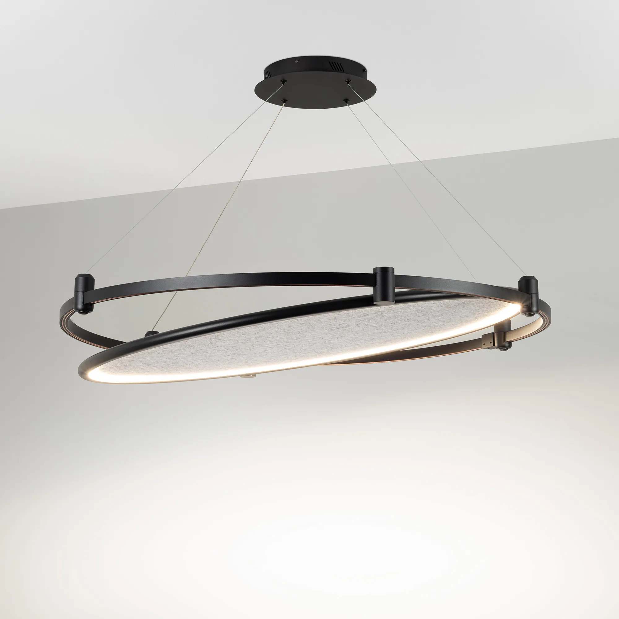 Светильник поворотный для треков APRIORI шириной 17 мм. Мощность 30 Вт, св. поток 481 лм, 15 лм/Вт, дневной 4000 K, CRI>90, угол 160°, напряжение питания 48 В. Черный круглый корпус из алюминия с серым акустическим материалом, степень защиты IP20. Размер: длина 1020 мм, ширина 980 мм, высота 55 мм. Монтаж на трек APRIORI 17 мм. Угол поворота корпуса 350°. Пульсация <1%. Возможно диммирование по ШИМ (PWM) или не адресное управление при использовании диммируемого драйвера Dali, 0-10V, TRIAC.