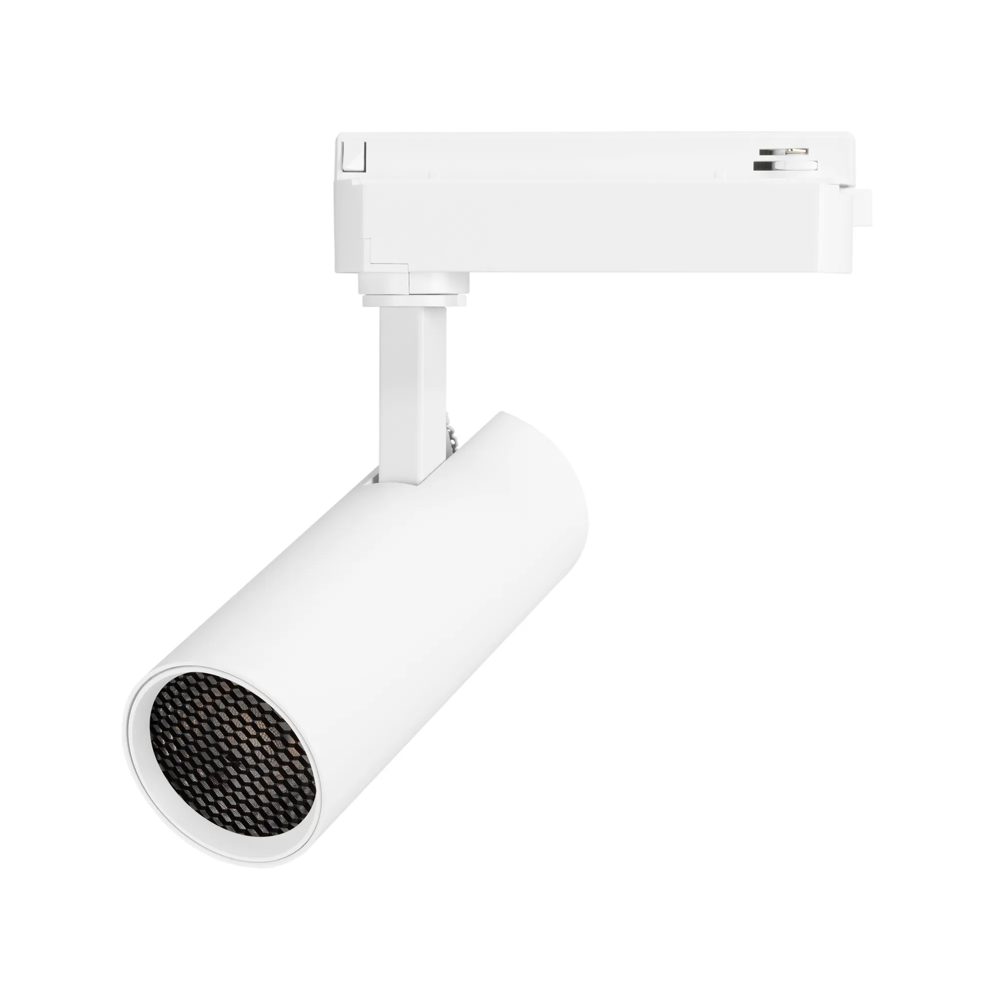 Светильник для треков/шин 2 провода. Мощность 15 Вт, св. поток без решетки honeycomb 1500 лм, 100 лм/Вт, с решеткой honeycomb 990 лм, 66 лм/Вт, дневной 4000 K, CRI>90, угол 24°, напряжение питания 230 В. Белый круглый корпус из алюминия, материал линзы PMMA, степень защиты IP20. Размер: диаметр 60 мм, длина световой части 141 мм. Монтаж на трек 1-фазный. Драйвер встроенный 350 мА 25-40 В, пульсация <5%.
