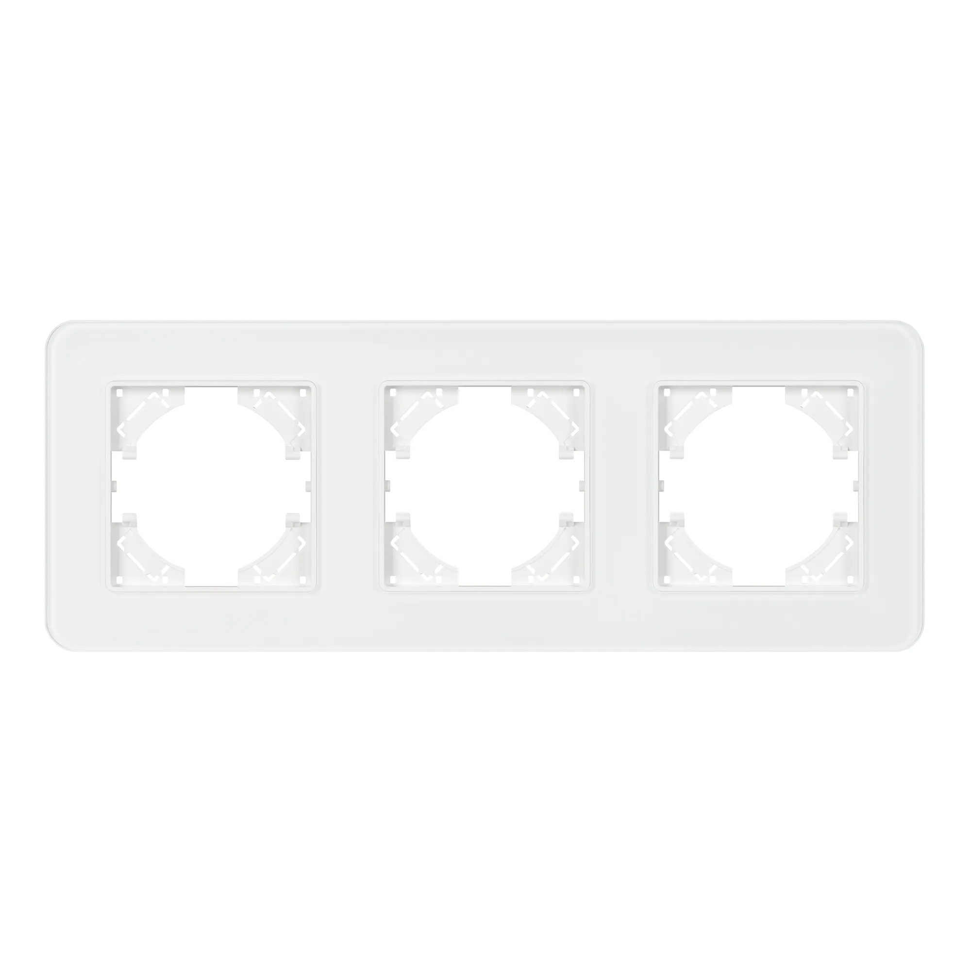Рамка стеклянная на 3 поста, под встраиваемый механизм. Цвет - белый с Soft-Touch покрытием. Среднего уровня герметичности IP20. Ориентация монтажа - горизонтальная (основным ориентиром служат посадочные выступы для накладки механизма).
