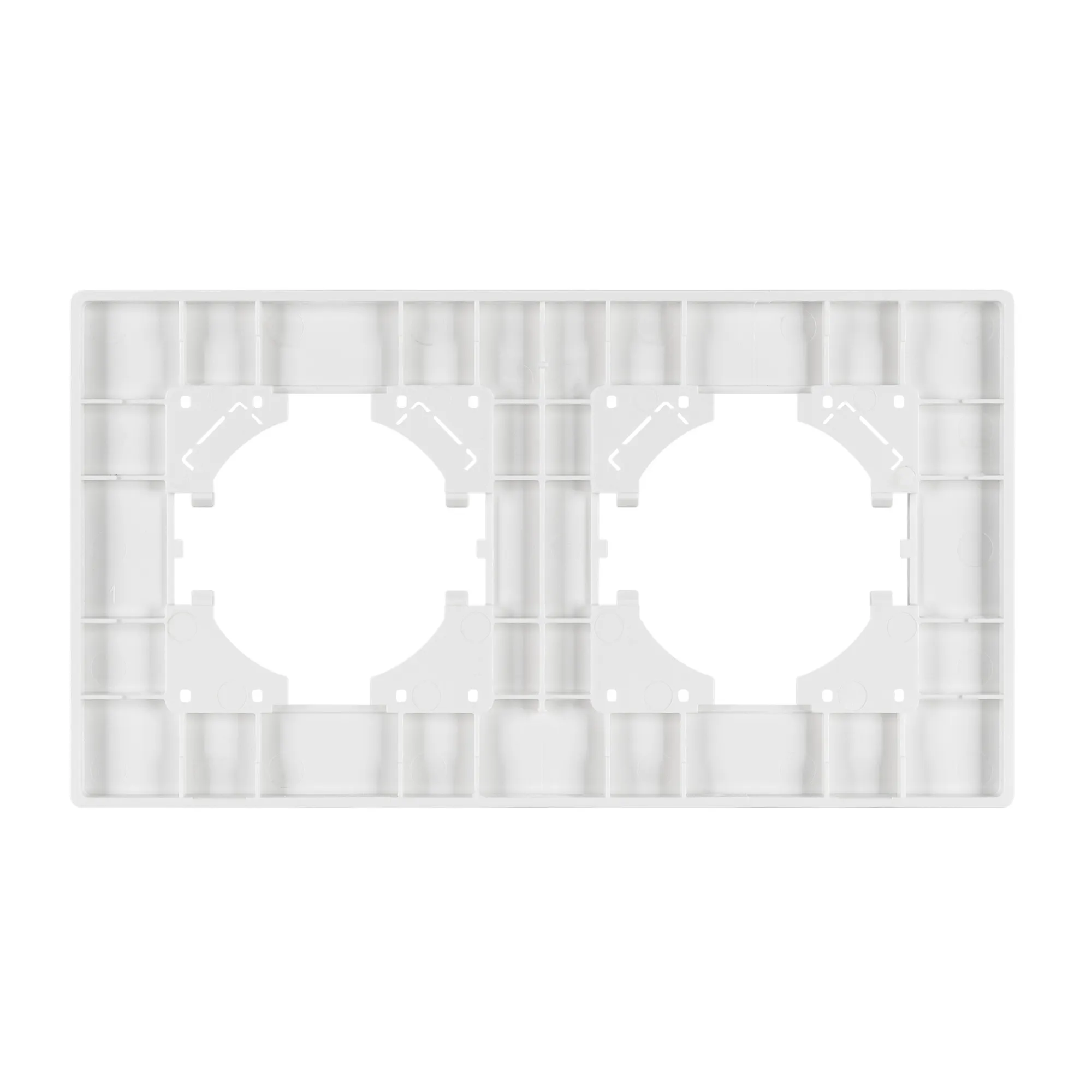 Рамка пластиковая на 2 поста, под встраиваемый механизм. Цвет - белый. Среднего уровня герметичности IP20. Ориентация монтажа - горизонтальная (основным ориентиром служат посадочные выступы для накладки механизма).