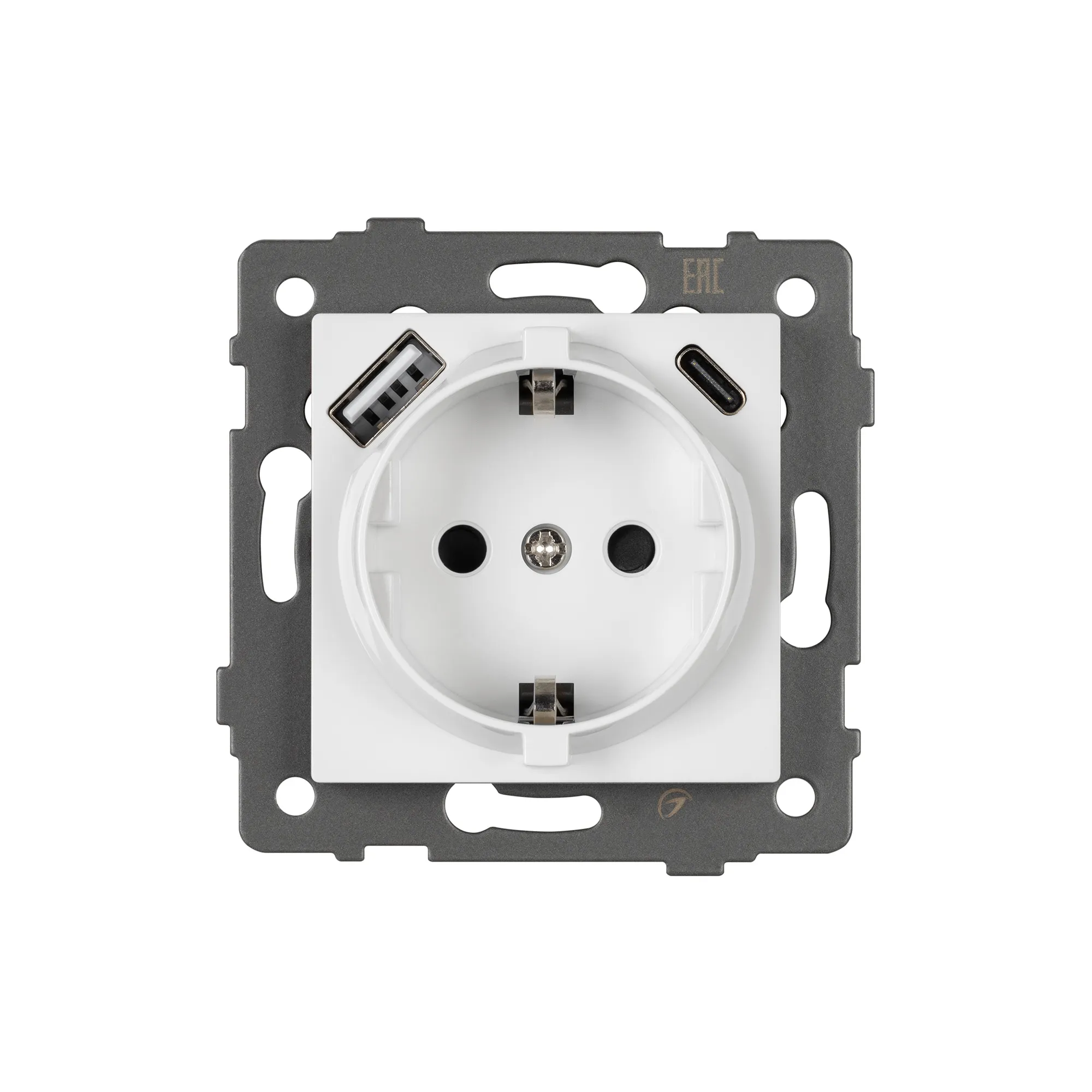 Механизм розетки с заземлением 1 пост 2 USB Type A+C порта. Цвет - белый. Без фронтальной рамки. Уровень пылевлагозащиты IP20. Устанавливается в стандартный подрозетник.