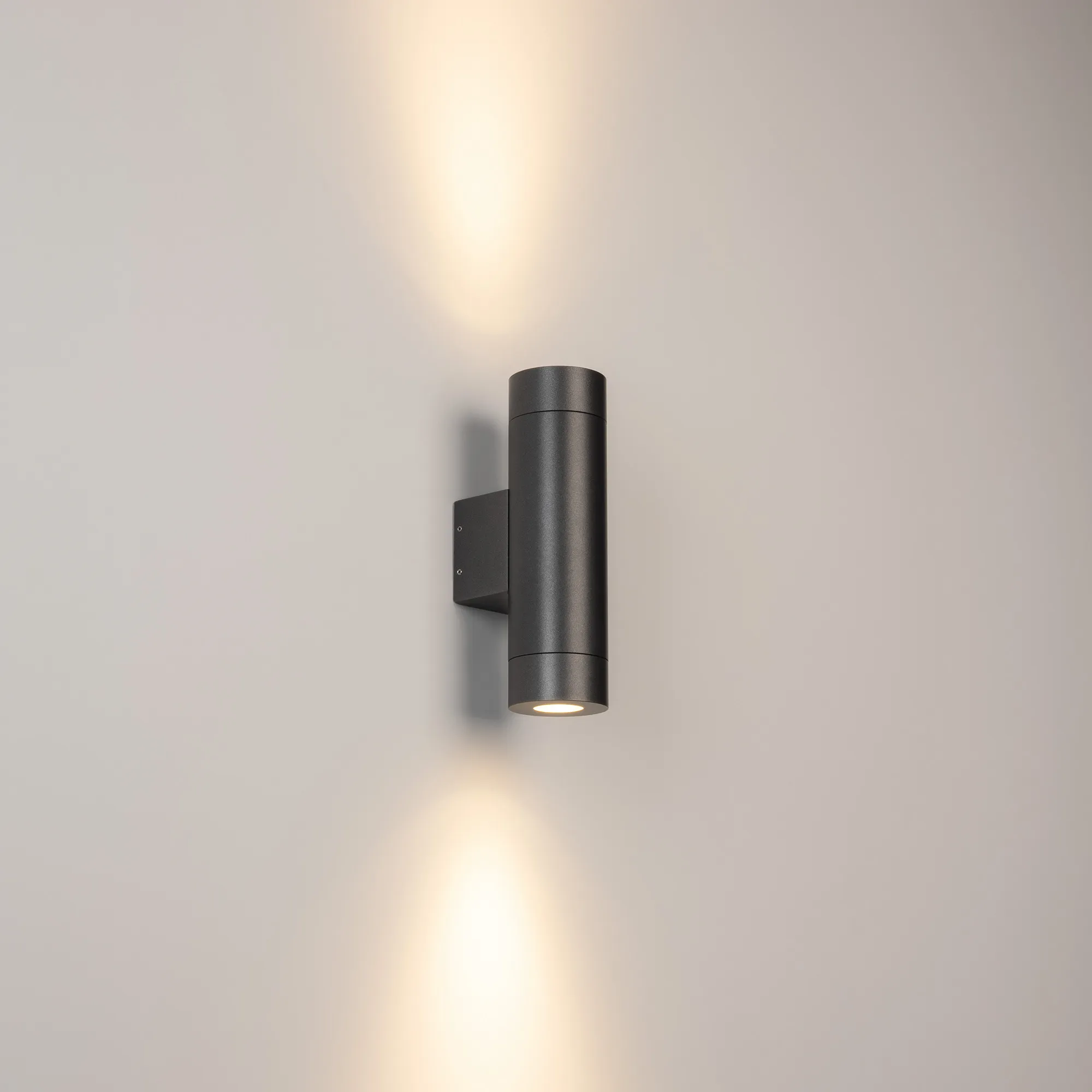 Накладной настенный светильник, свечение вверх/вниз. Мощность 24 Вт, св. поток 740 лм, 31 лм/Вт, теплый 3000 K, CRI>80, угол 2x6°, напряжение питания 230 В. Темно-серый фигурный корпус из алюминия, экран стекло, степень защиты IP65. Размер: длина 98 мм, ширина 65 мм, высота 220 мм. Монтаж накладной. Драйвер встроенный, пульсация <1%.