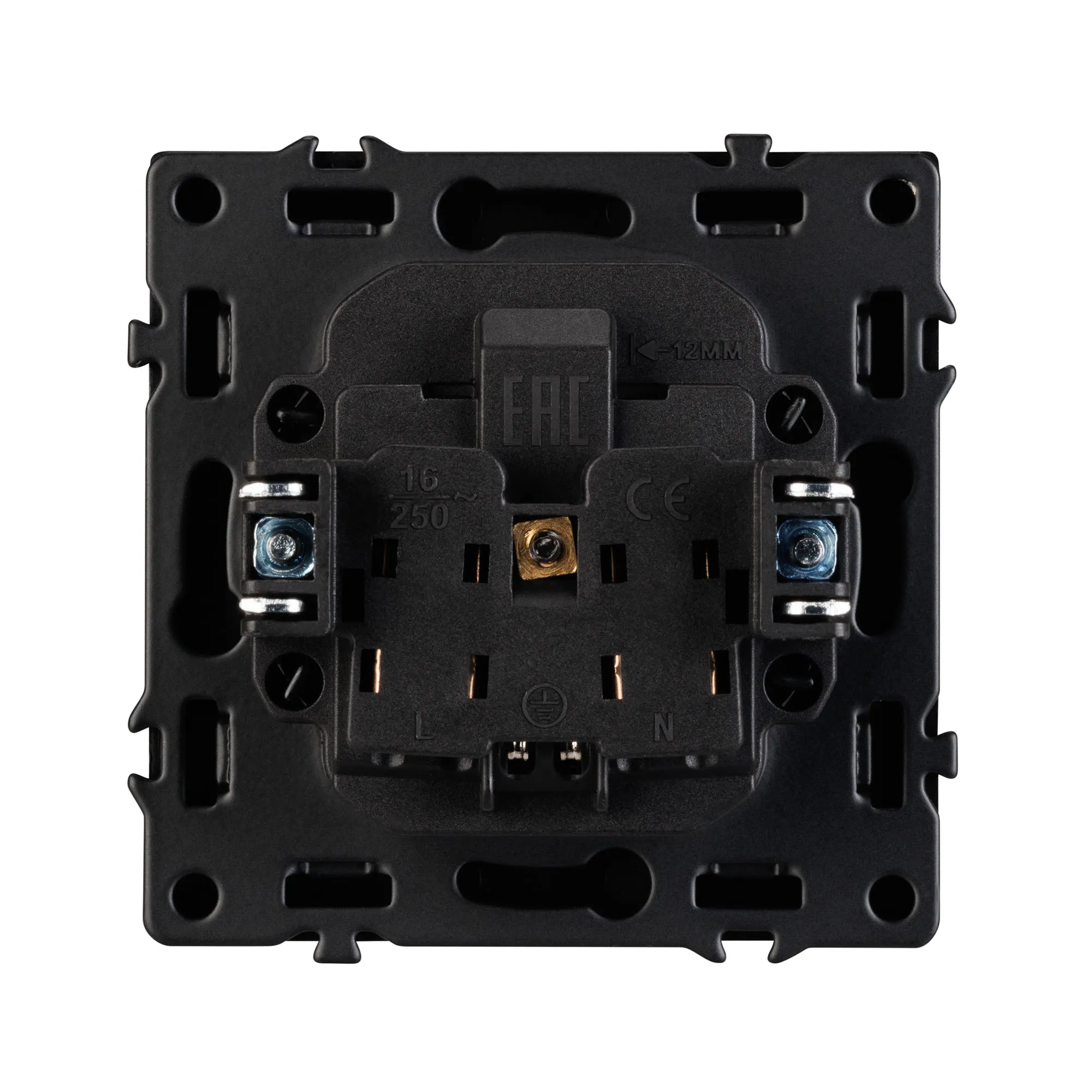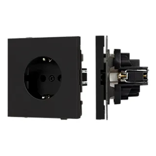 Механизм розетки с заземлением на 1 пост. Цвет - черный, с Soft-Touch покрытием. Без фронтальной рамки. Уровень пылевлагозащиты IP20. Розетка устанавливается в стандартный подрозетник круглого сечения диаметром 60мм.
