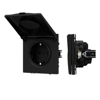 Механизм розетки с заземлением и влагозащитной крышкой на 1 пост. Цвет - черный, с Soft-Touch покрытием. Без фронтальной рамки. Уровень пылевлагозащиты IP44. Розетка устанавливается в стандартный подрозетник круглого сечения диаметром 60мм.