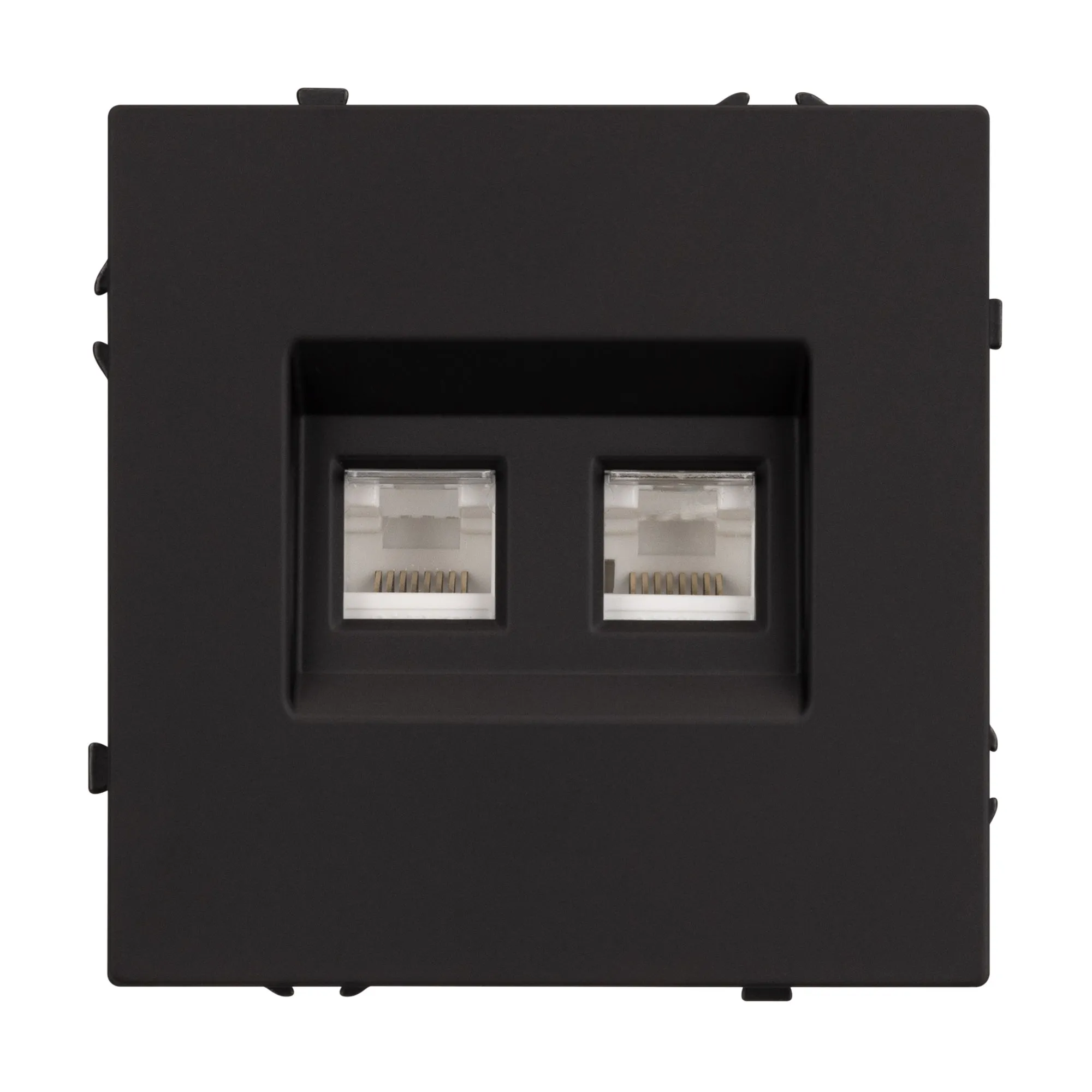 Механизм компьютерной розетки на 2 поста 6-й категории. Цвет - черный, с Soft-Touch покрытием. Без фронтальной рамки. Уровень пылевлагозащиты IP20. Тип подключаемого разъема - RJ45. Розетка устанавливается в стандартный подрозетник круглого сечения диаметром 60мм.