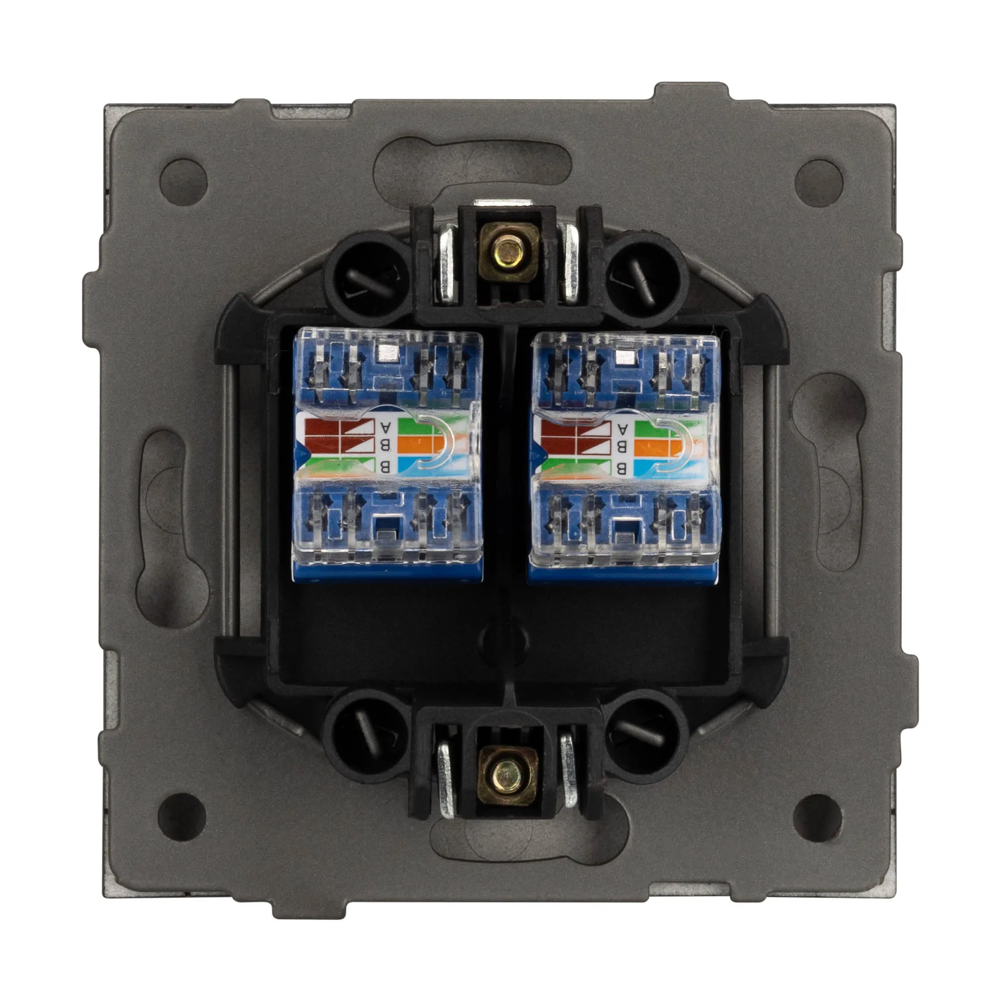 Механизм компьютерной розетки на 2 поста 6-й категории. Цвет - черный, с Soft-Touch покрытием. Без фронтальной рамки. Уровень пылевлагозащиты IP20. Розетка устанавливается в стандартный подрозетник круглого сечения диаметром 60мм.