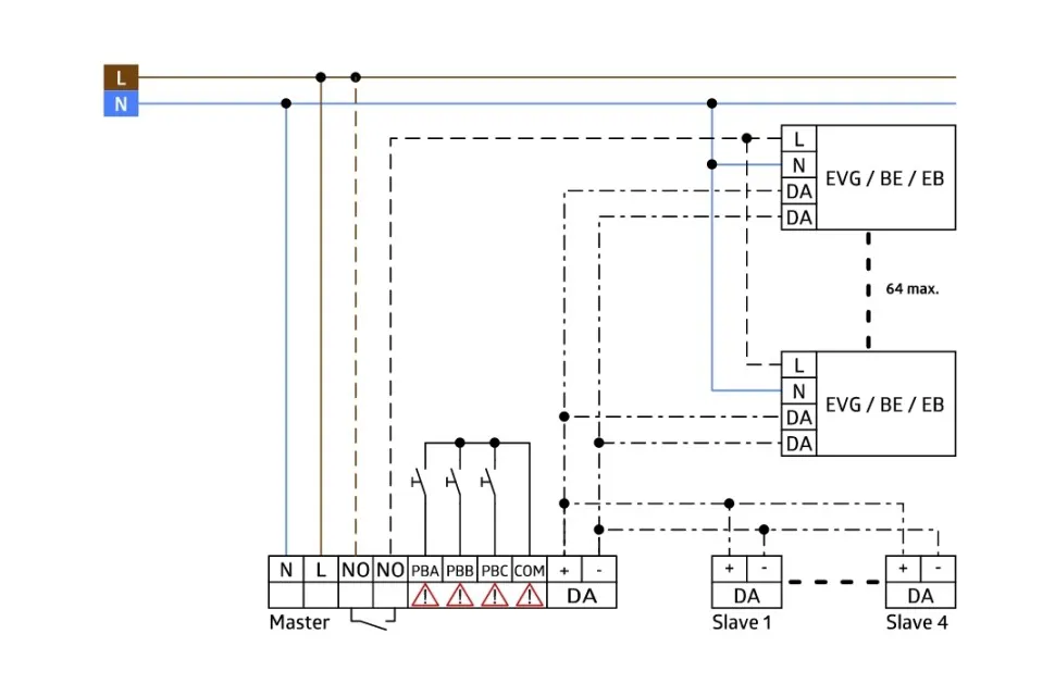 - До 4-х дополнительных Slave-устройств может быть подключено к шине DALI для расширения диапазона обнаружения.
