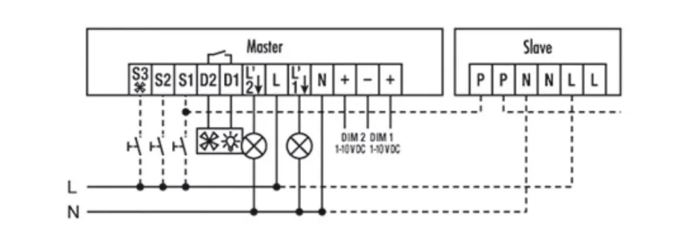 - Автоматическое управление осветительными приборами (канал 1 + 2) для поддержания постоянной яркости освещения в зависимости от присутствия людей и интенсивности дневного света (интерфейс 1-10 В =)