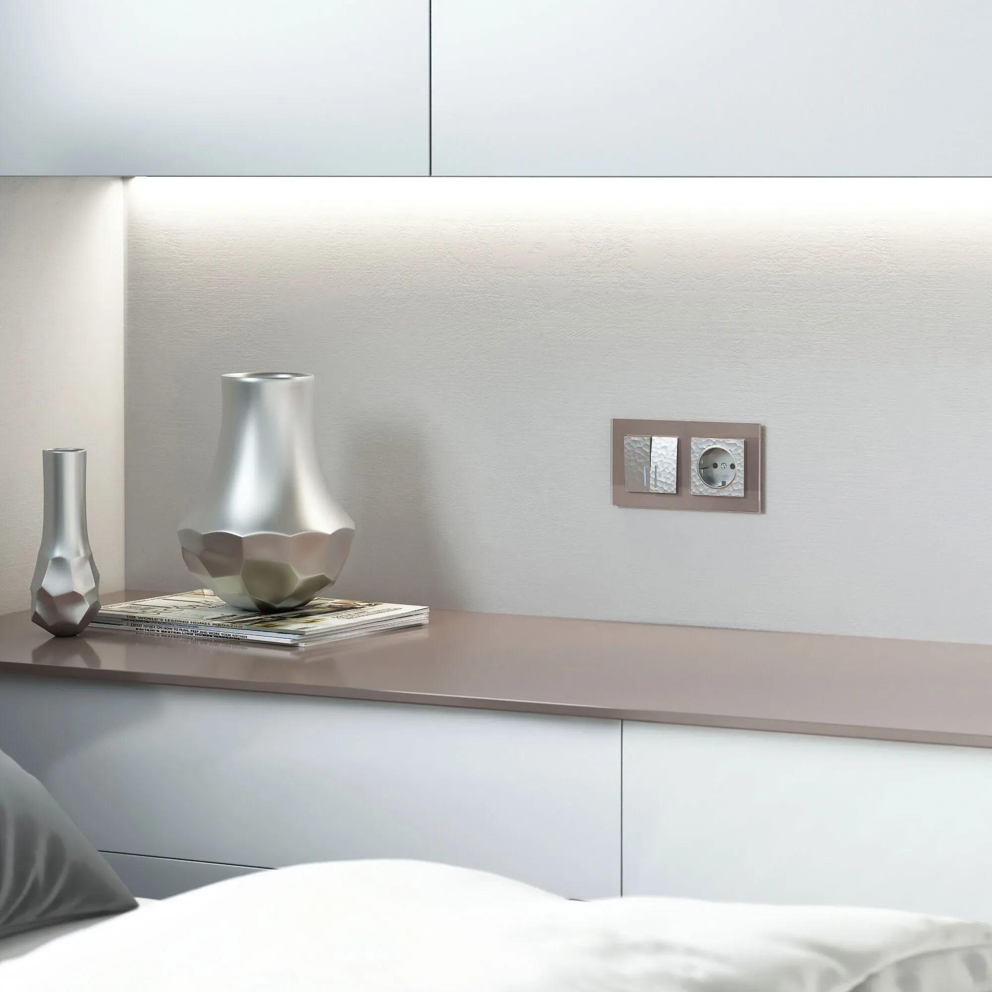 Рамка Favorit выполнена из закаленного стекла толщиной 5 мм. Идеально отшлифованные грани, подчеркнутые прямой фаской, создают необычайную игру света и придают дополнительный объем стеклу.